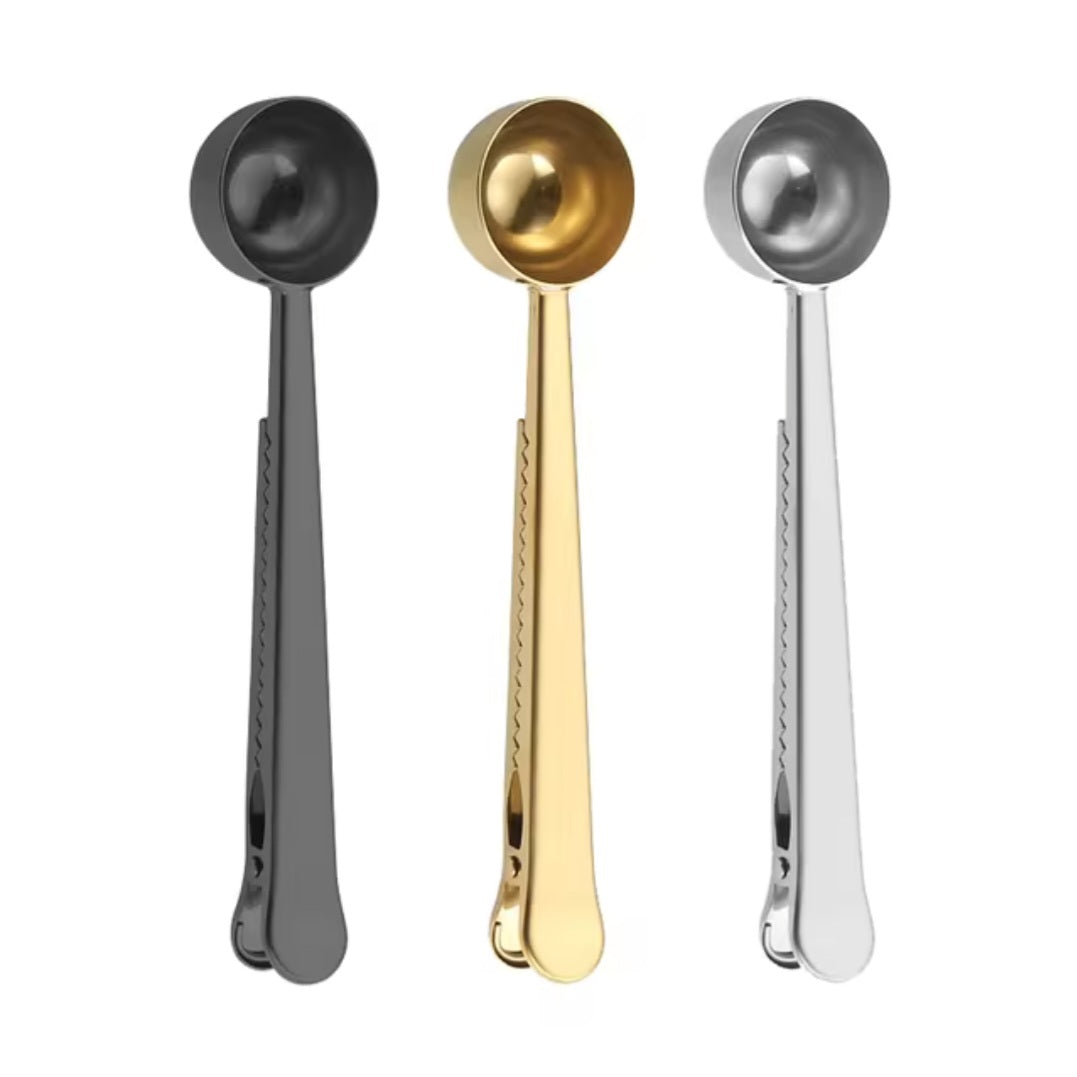 Stainless steel black 2 - in - 1 ground coffee measuring spoon/scoop with bag clip to ensure your coffee stays sealed and fresh.