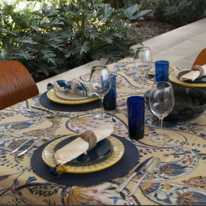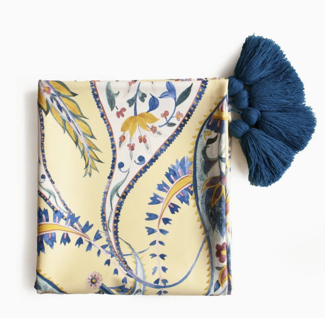 With a pale-yellow base, soft blue florals, and leafy accents, the Amalfi Table Runner brings a light, nature-inspired touch that moves effortlessly from late summer into early fall, finished with tassels for added texture, it's perfect for seasonal gatherings.