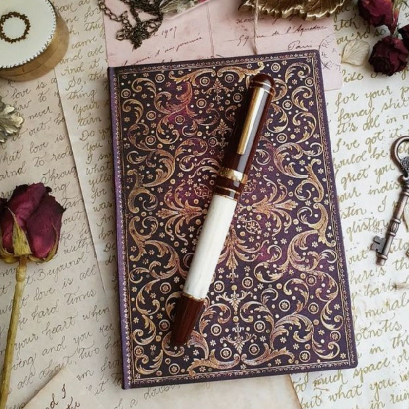 Our Aurelia softcover journal design is fit for a Queen. its inspiration dates back to Paris in the mid-18th century and the original binding housed copies of \king Louis XV's procedures for Holy Week. The design is a marvelous riott of gold-tooled rococo elements, featuring flowers and leaves.