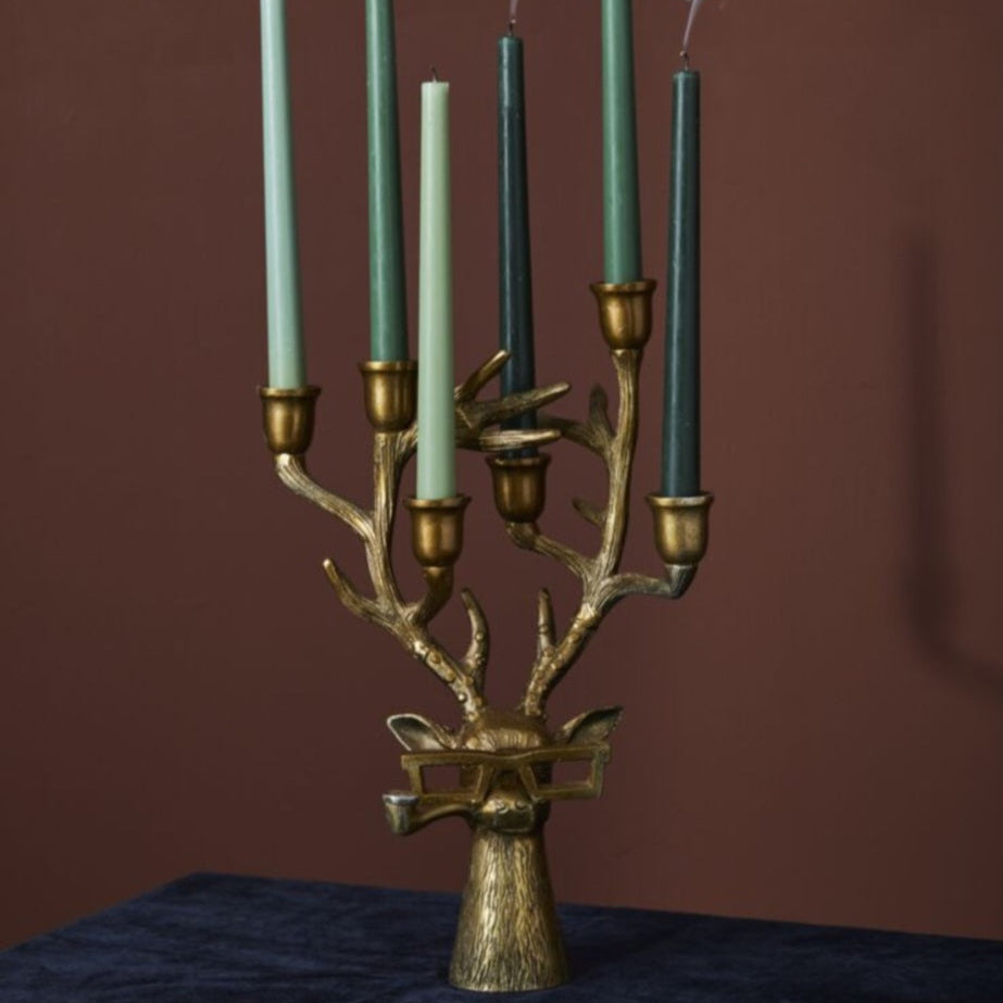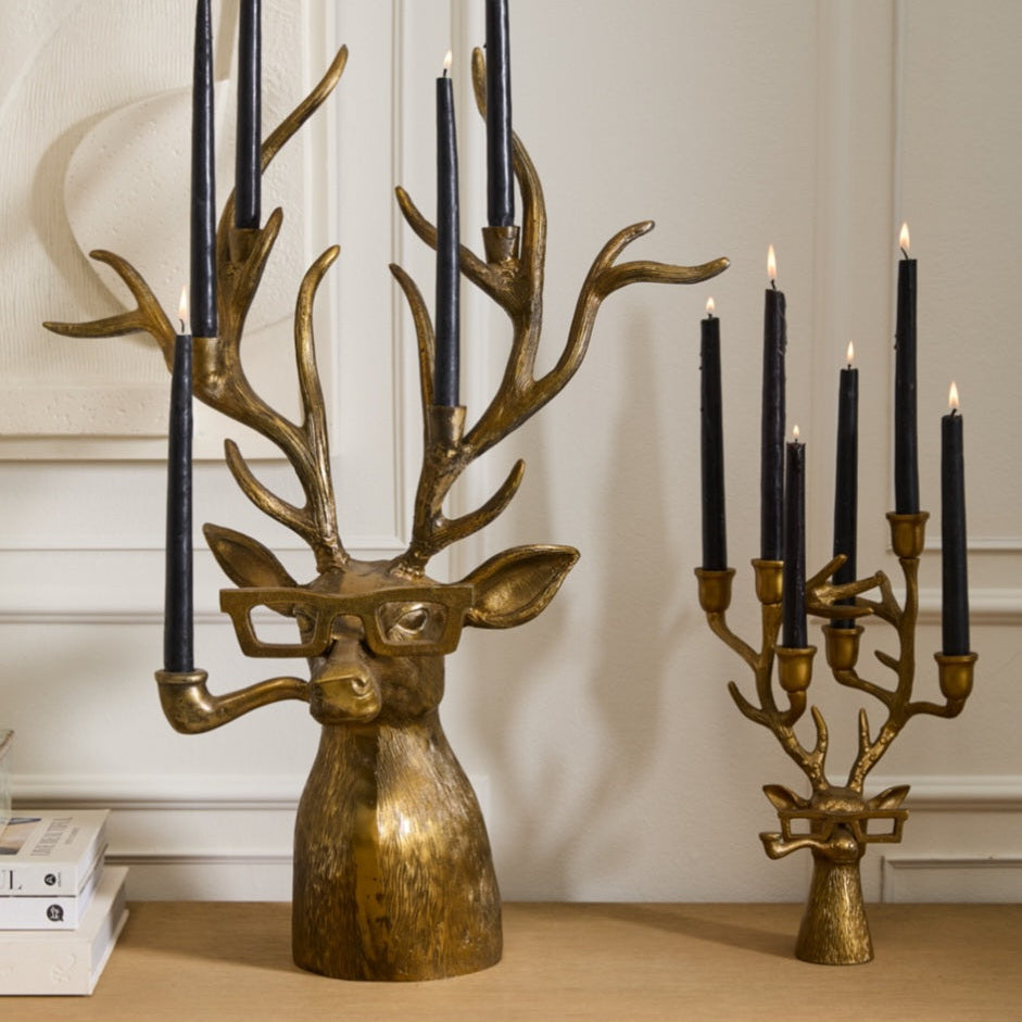 The small bust version of the beloved Frankie wall mount features a bespeckled cast aluminum buck with slots for 6 standard tapered candles in his antlers atop a sturdy base.