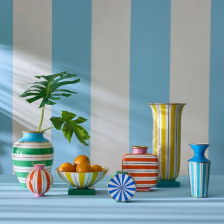 Stripes never go out of style - especially when they come wrapped around high-fired porcelain in bold, candy - colored hues. Jonathan Adlers Portofino vessels bring playful polish with a glossy finish and classic silhouettes to suit any setting. These pieces serve instant jet-set charm.