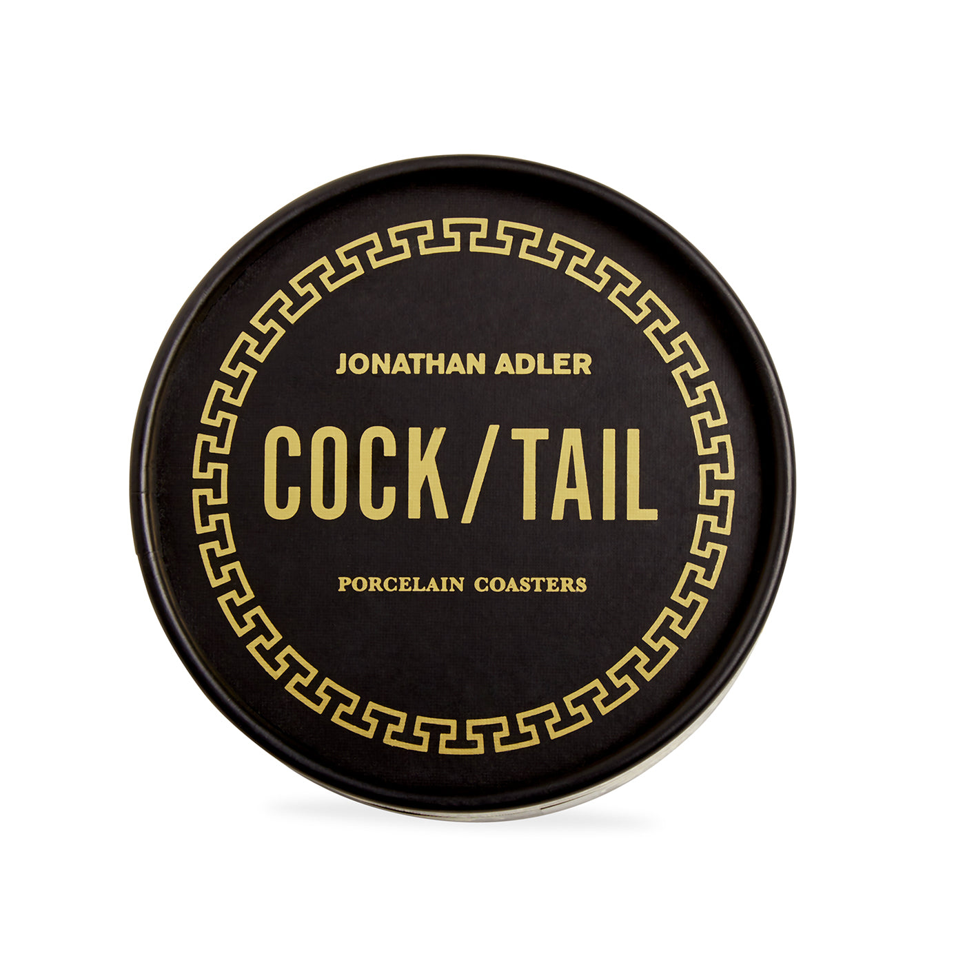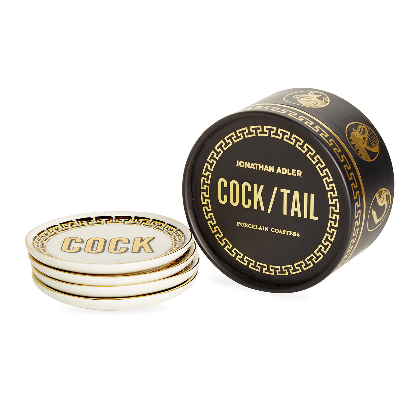 Jonathan Adlers Cock-Tail coasters serve up bold statements on high-fired porcelain, finished with real gold accents and tucked into a cheeky little gift box. Perfect as a hostess gift or a well-deserved treat for yourself.