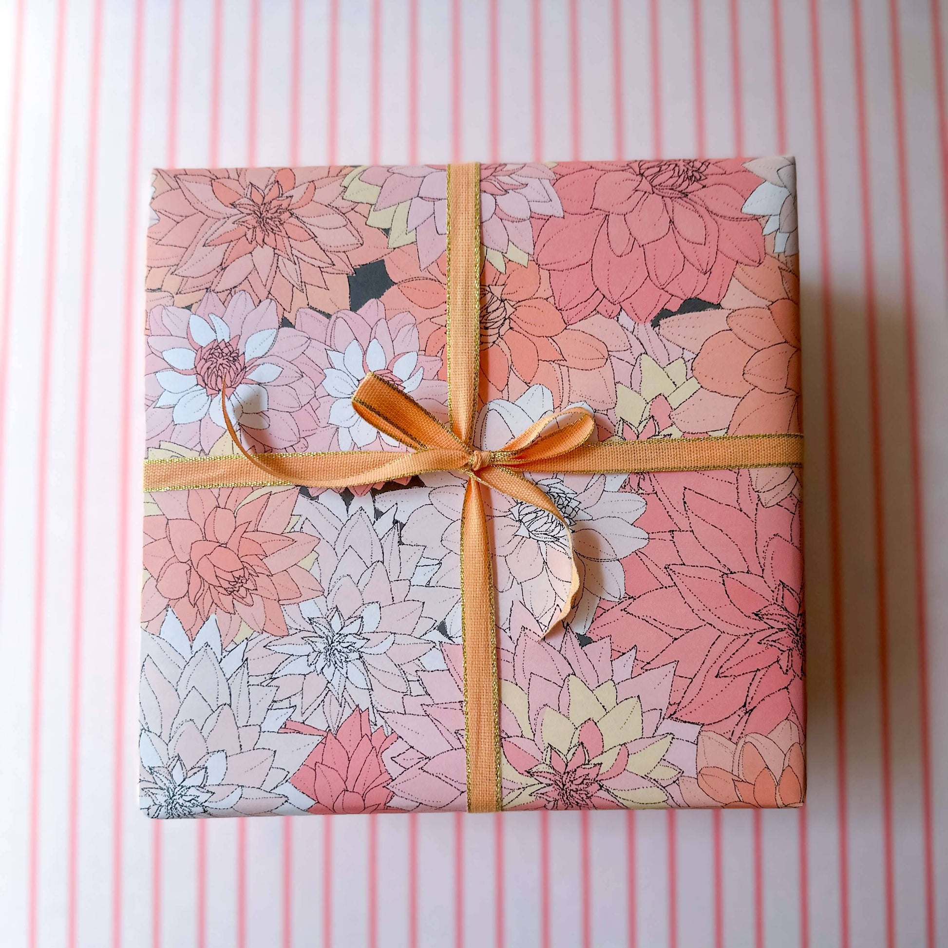 This luxury double-sided wrapping paper features dahlias in a wide palette of pinks. The opposite side features peach stripes on a pale pink background.