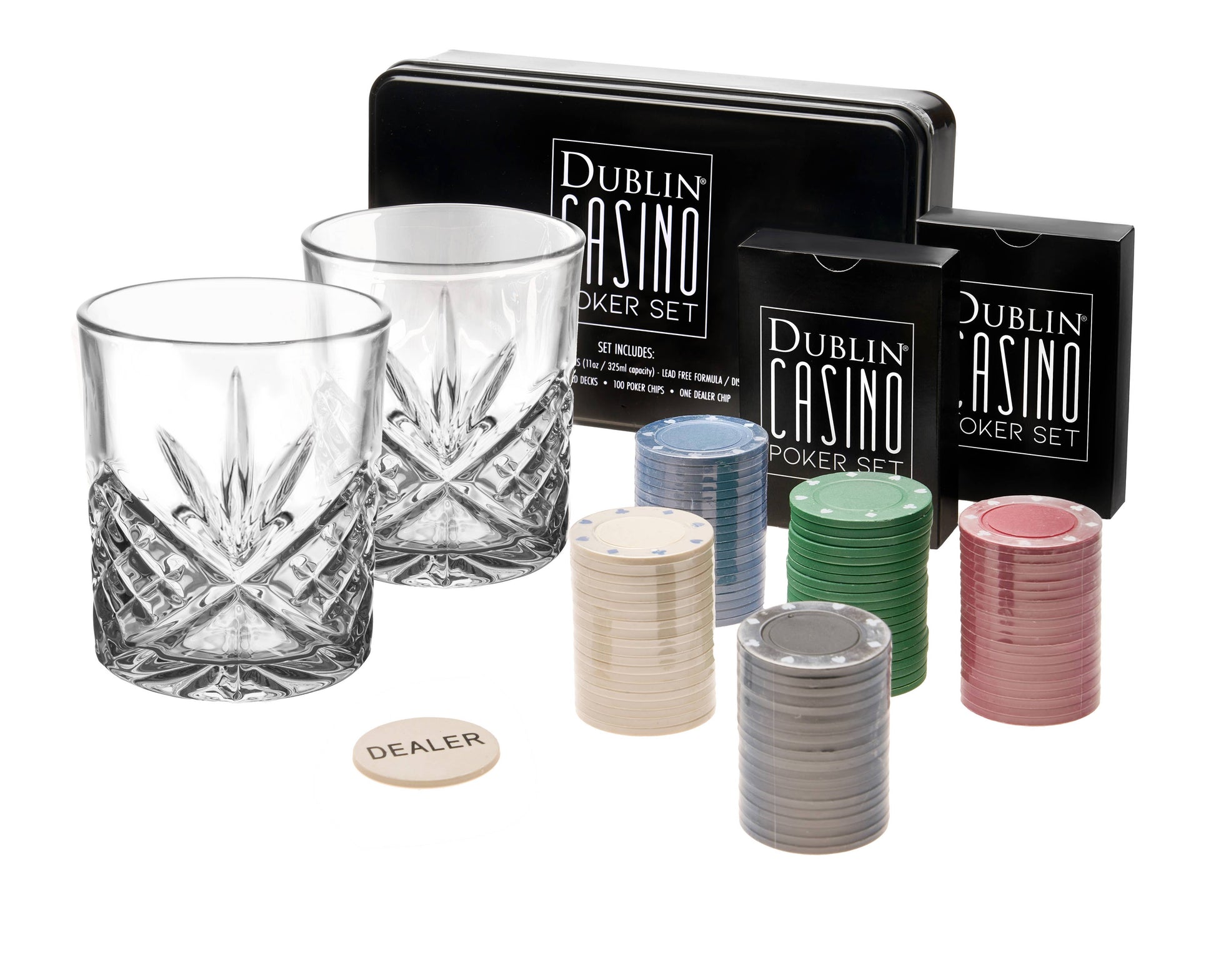 Level up game night with our sleek casino set - complete with poker chips, playing cards, and two crystal whiskey glasses.