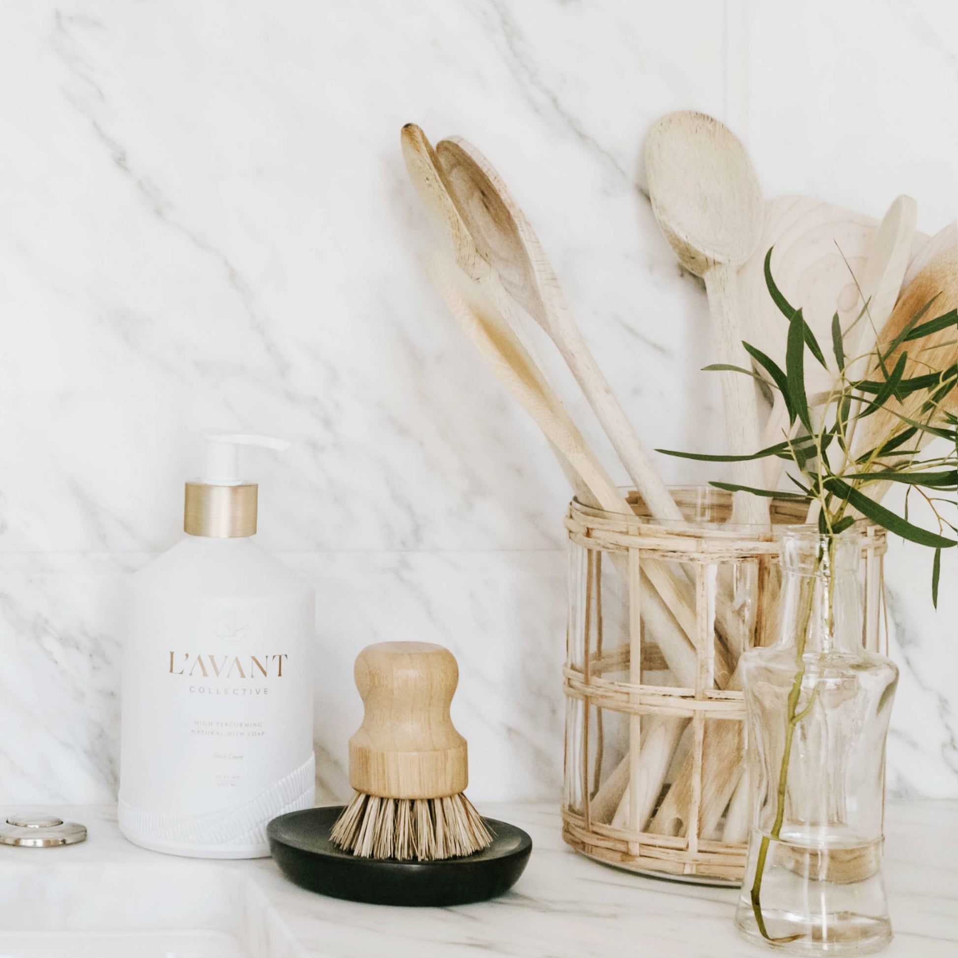 L’avant collective powerful dish soap has it all in one gorgeous, matte white glass bottle: plant-based ingredients, reusable bottle, and a high-performing formula.