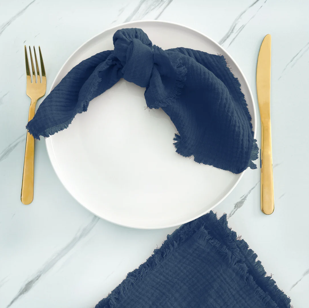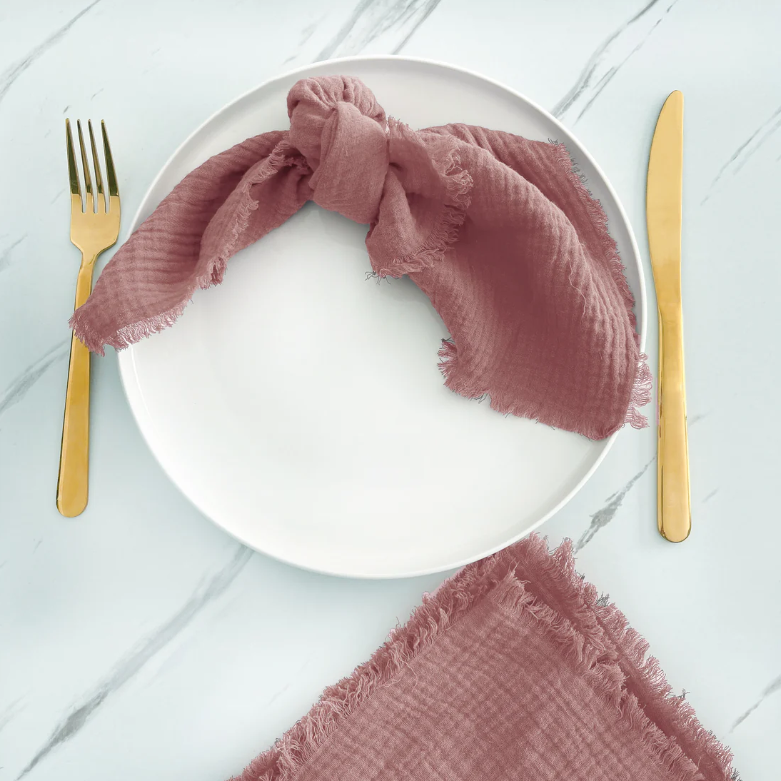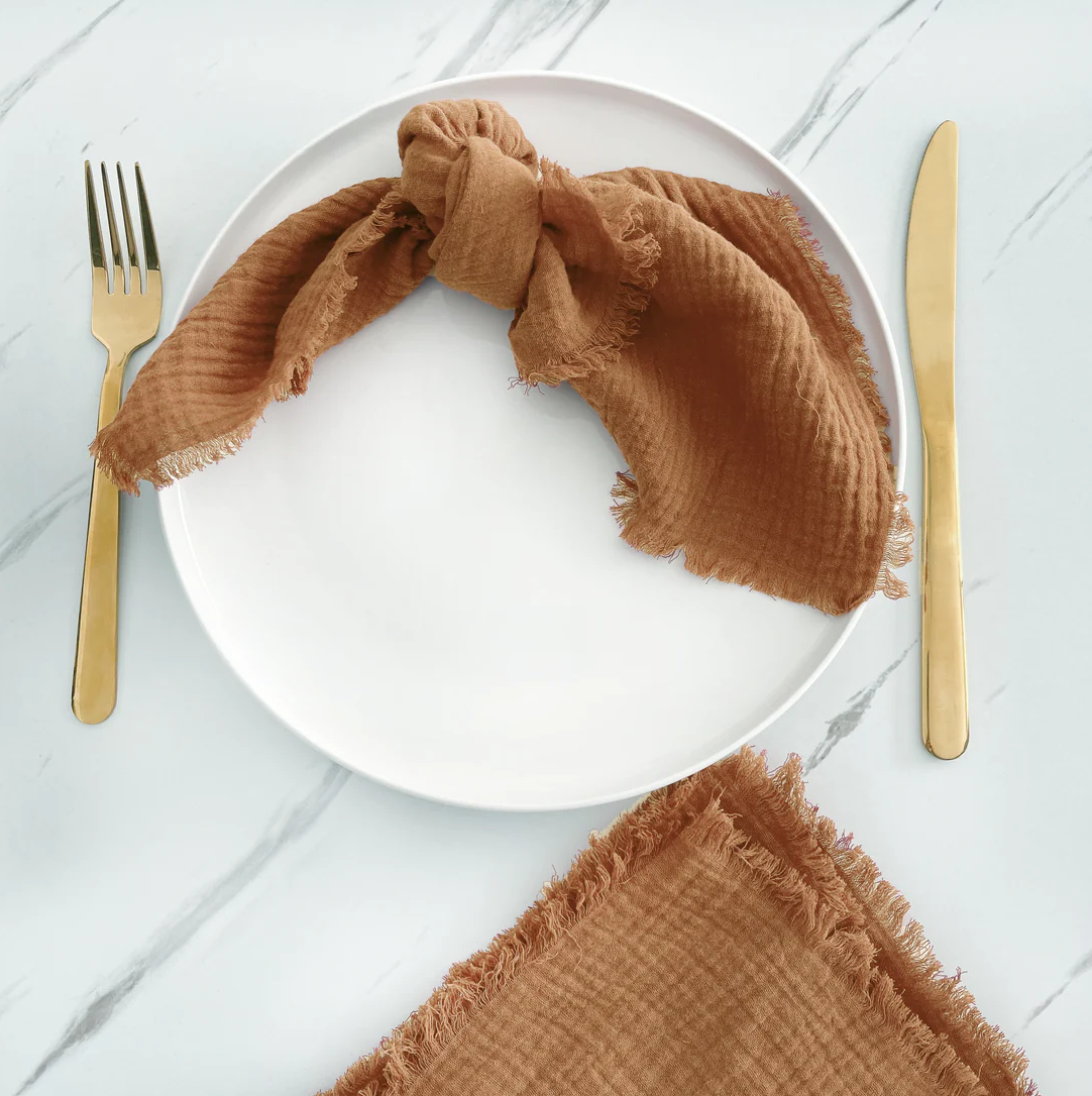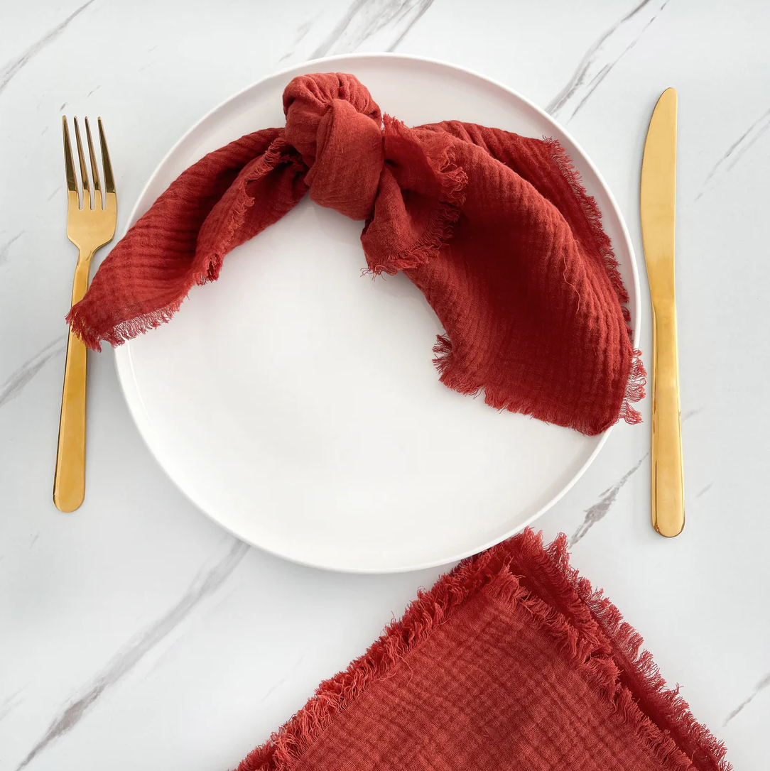Our Natural Gauze Fringe Napkins are perfect for everyday family meals or special events Handmade from 100% double muslin cotton.