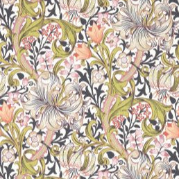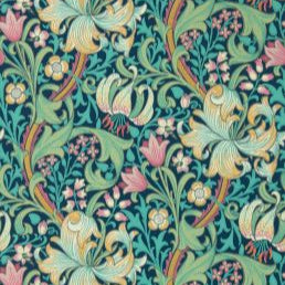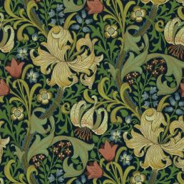 The strong diagonal arrangement of J.H. Dearles Golden Lily (1899) gives structure to the entwining lily stems and tendrils. One of Morris & Co.'s greatest legacies Golden Lily is available in six striking colorways in the Archive Wallpaper collection.