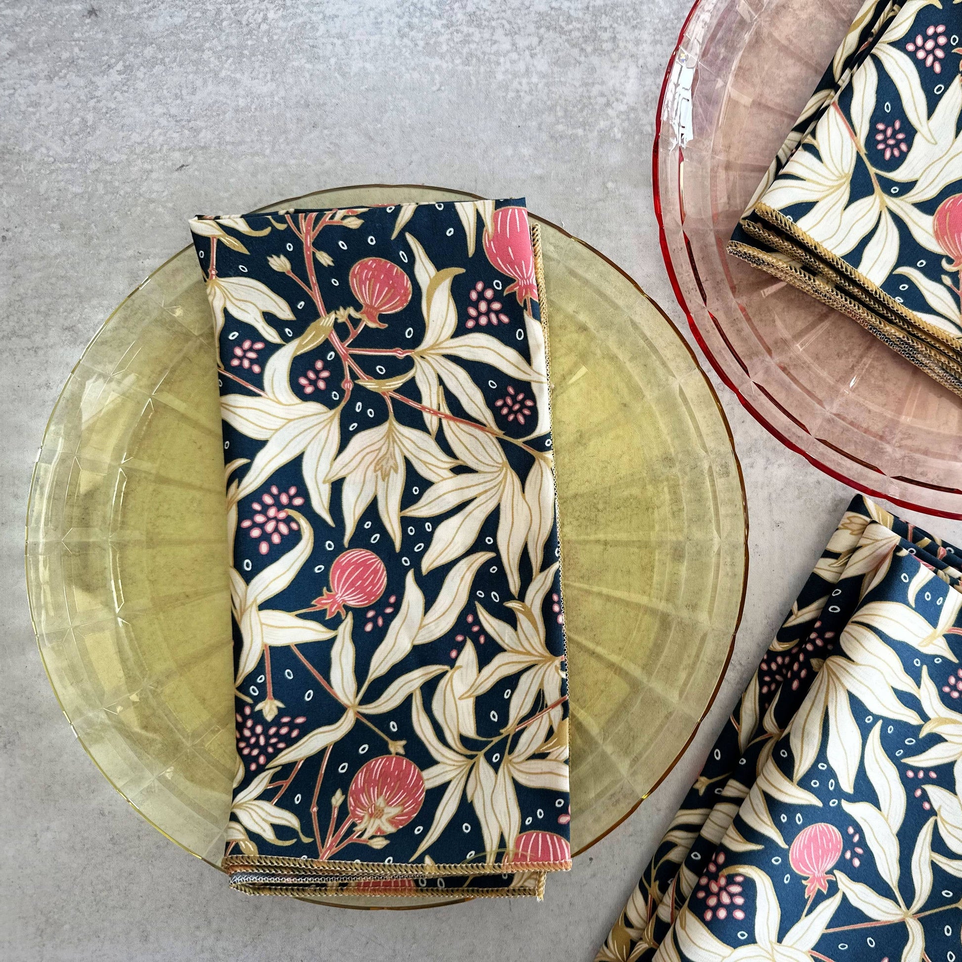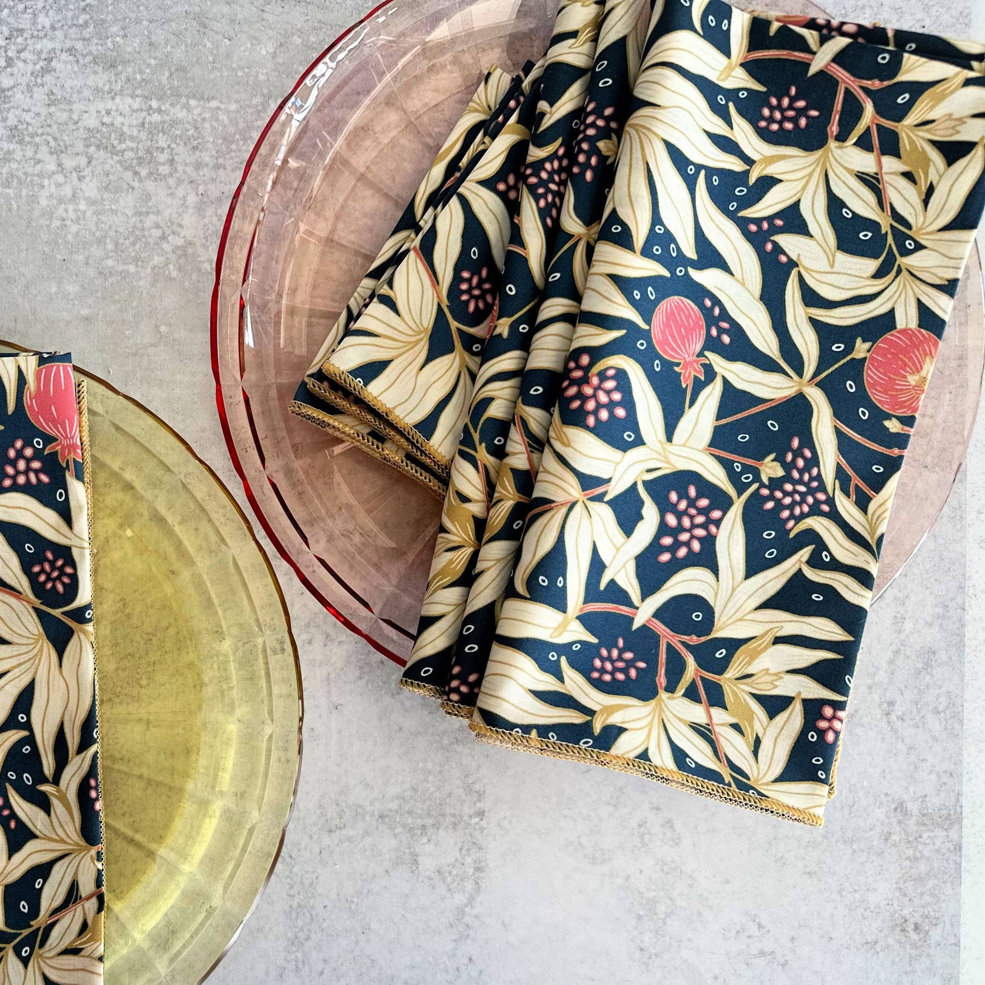 One of our newest sets with a navy blue background, pretty pinks and hints of honey. Super soft and easy to care for. 100% cotton set of four
