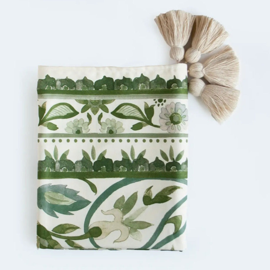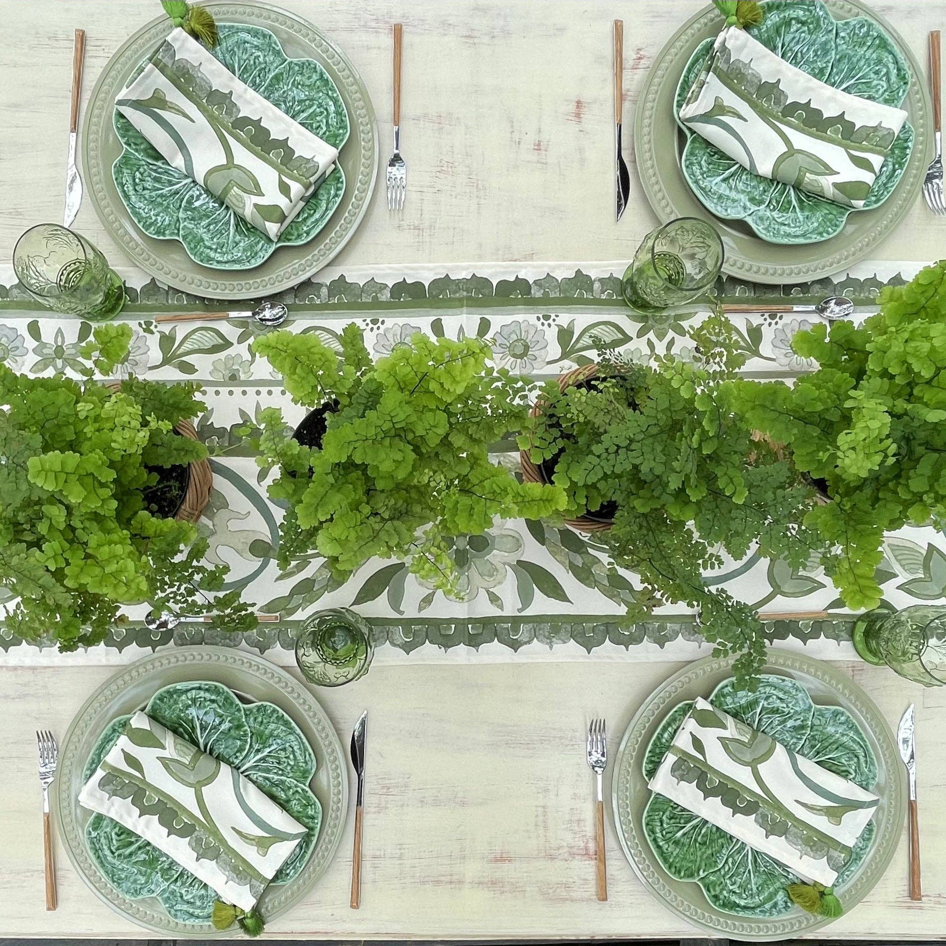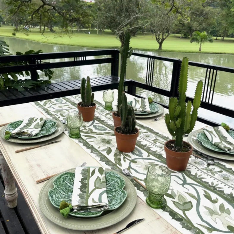 With soft green tones, floral detailing, and creamy tassels, the Jade Table Runner adds a fresh yet grounded elegance to your table. Its earthy palette makes it perfect for late summer gatherings and an easy transition into cozy fall decor.