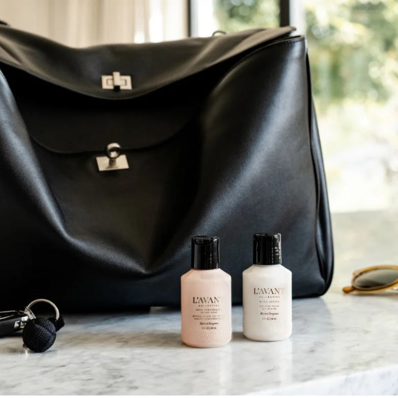 Refresh on the go with L'avant mini hand care set - includes a 2oz hand soap and lotion in Blush Bergamot, featuring notes of bergamot, orange blossom, amber, and cedar. Ideal for travel, hotels, and airplanes. Clean, hydrate, and enjoy a touch of luxury anywhere.