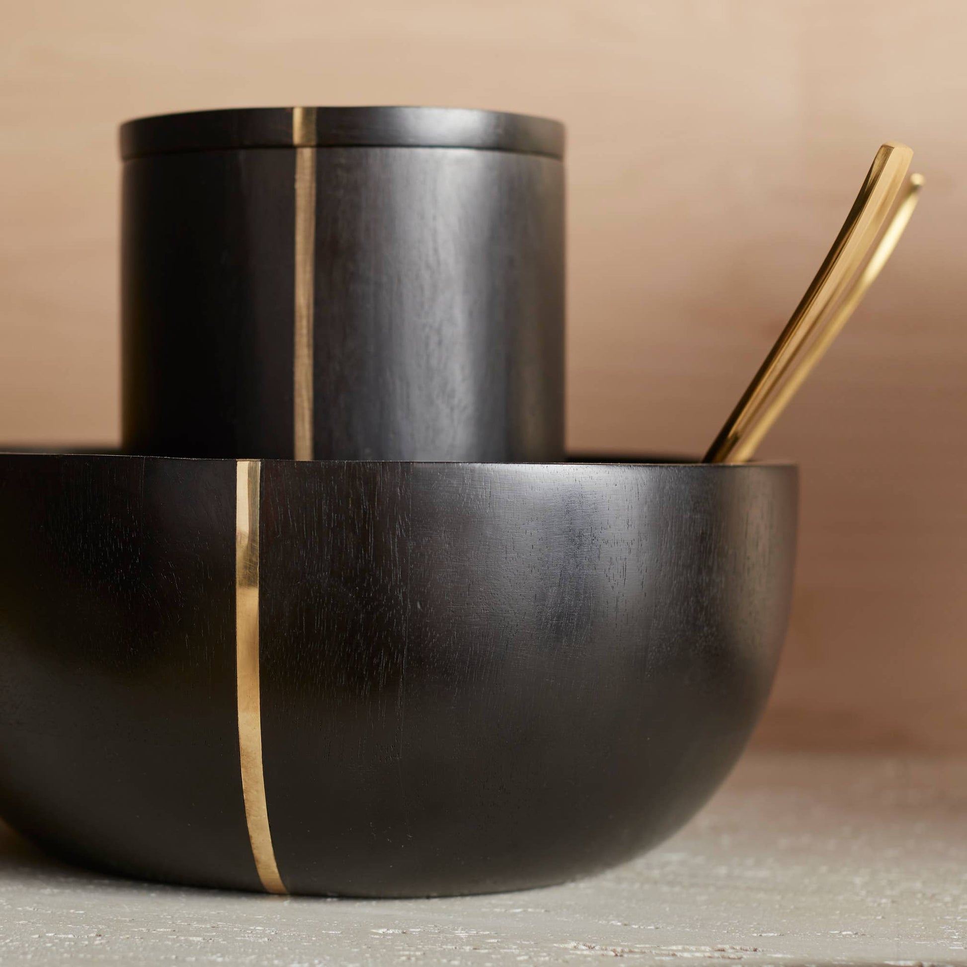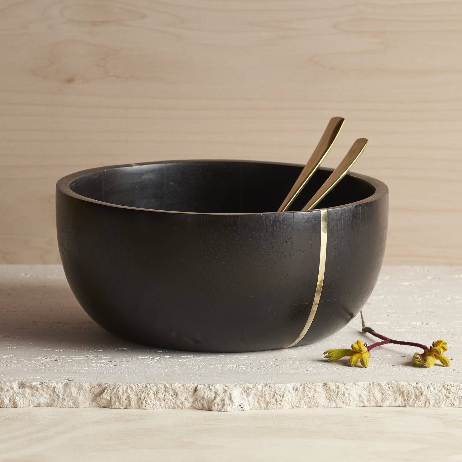 Bring sophistication to the table with this dark, deep wooden serving bowl accented with an inlaid stripe of polished brass. Each stunning piece is handcrafted with care by expert artisans using traditional methods. Eye-catching on its own, the thick-walled bowl looks even more enticing when filled with crisp salad or colorful fruit. Limited.