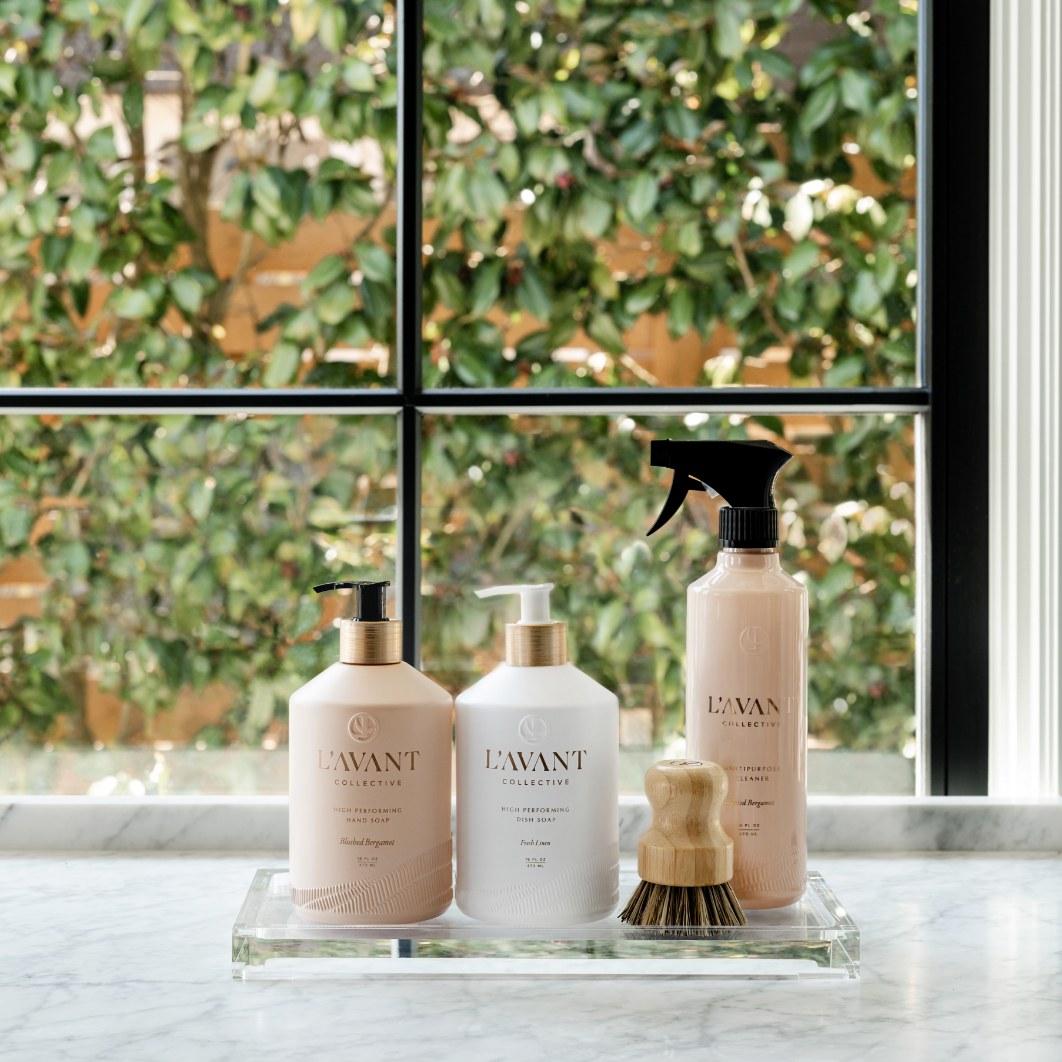 Experience the L'AVANT cleaning experience with our Multipurpose Surface Cleaner in our new Blushed Bergamot scent. Crafted with plant-based ingredients, effortlessly remove dirt and grime while being immersed in a delightful aroma of lush bergamot and tangerine, balanced with moody amber and cedar. Perfect for use on stone, wood, glass, mirrors, or ceramic, its multi-use multipurpose formula is sure to keep any surface clean and fragrant! Our luxury recycled plastic bottle can be refilled again and again thanks to our amazing multipurpose concentrate. Packaged in 1 oz.