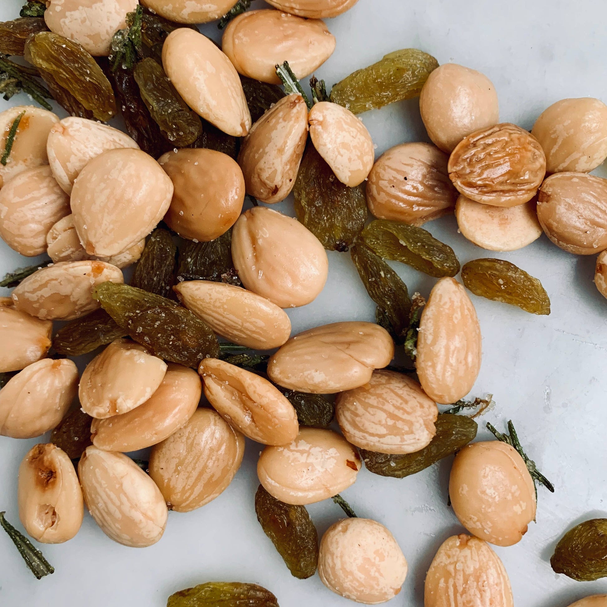 Marcona Almonds, Candied Rosemary, Green Raisin 04 Valencia Almonds, Organic Tart Cherry, Spicy Chili 06 Marcona and Valencia Almonds, Sea Salt