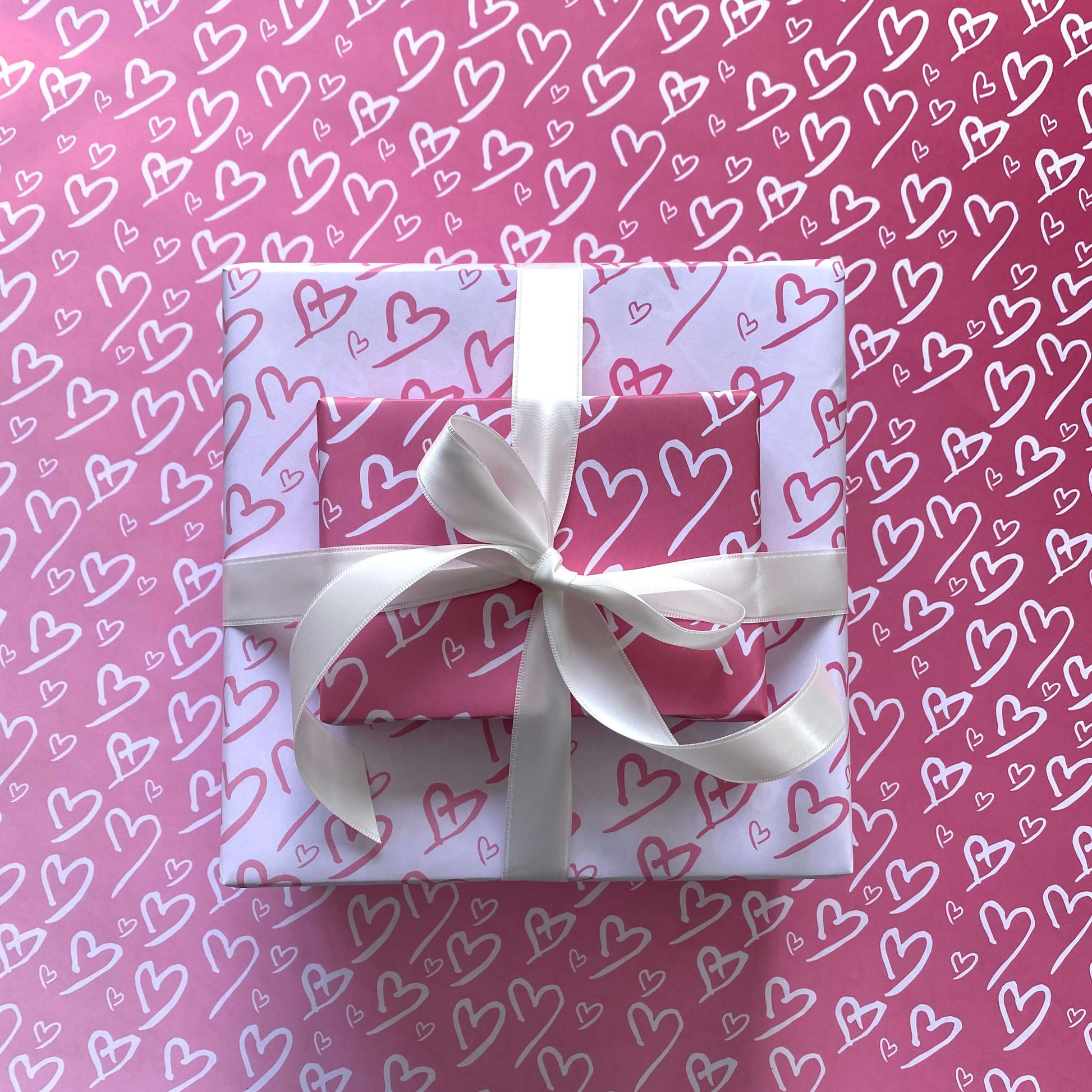 This luxury double-sided wrapping paper features white hearts on an ombre pink background. The opposite side features ombre pink hearts on a pale pink background.