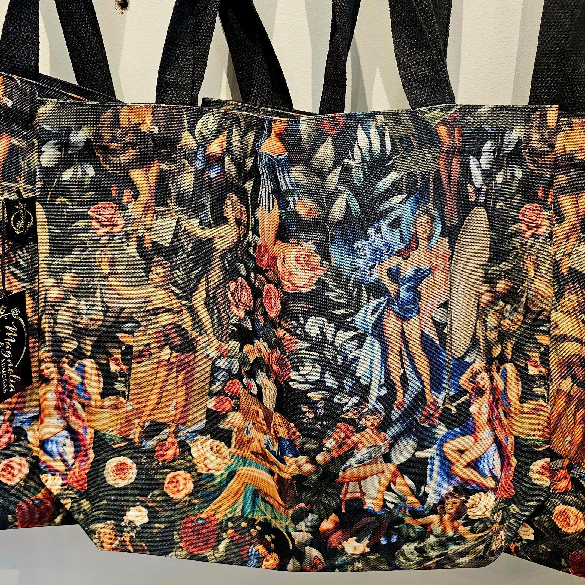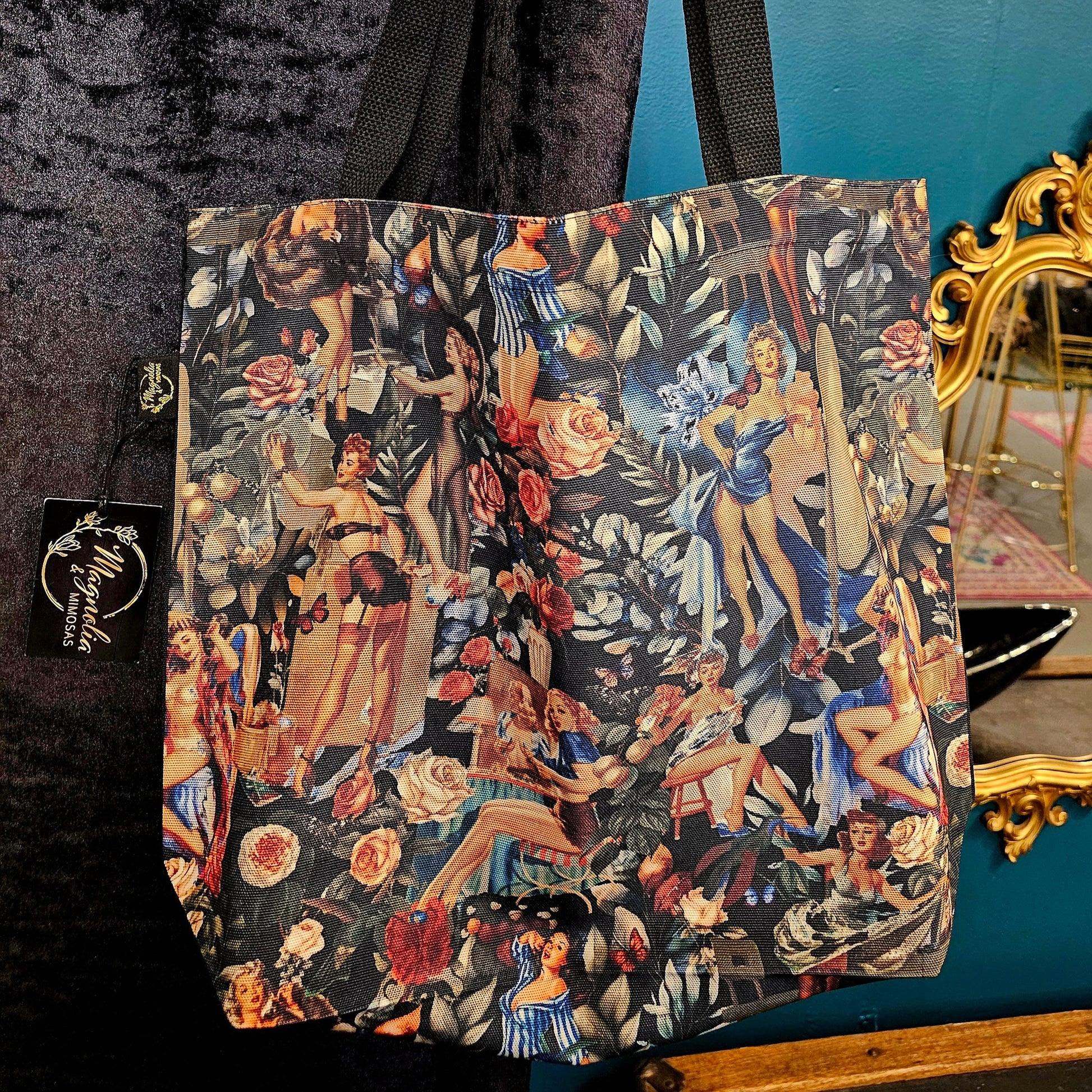 Add a touch of retro glamour to your daily style with Magnolia and Mimosas exclusive Pin-Up Tote Bag! Featuring vibrant pin-up girls set against a sleek black background, this chic bag exudes vintage charm. A perfect gift for yourself or a friend who loves to have fun with style.