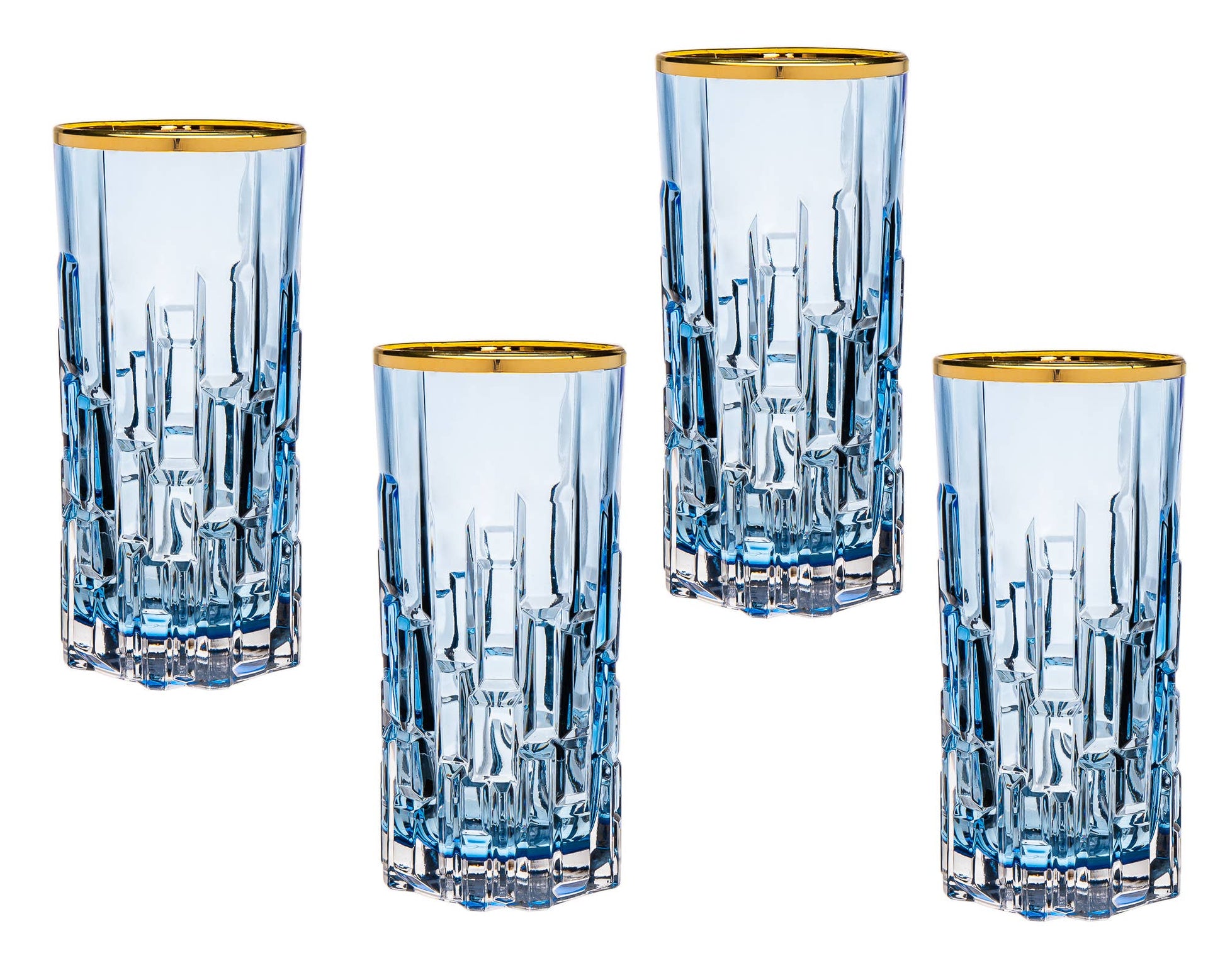 Blue Crystal Highball Glasses with Gold Rims - Set of 4