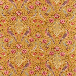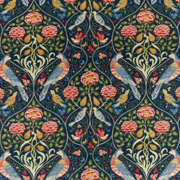 Seasons by May is our interpretation of a c.1895 embroidery called ‘Spring and Summer' designed and most likely stitched by May Morris. Produced on an textured cloth our version features a mirrored trellis of parakeets stylish roses tulips leaves and turning stems accented with intricate detail across the feathers and petals. Available in three colorways: Linen Indigo and Saffron