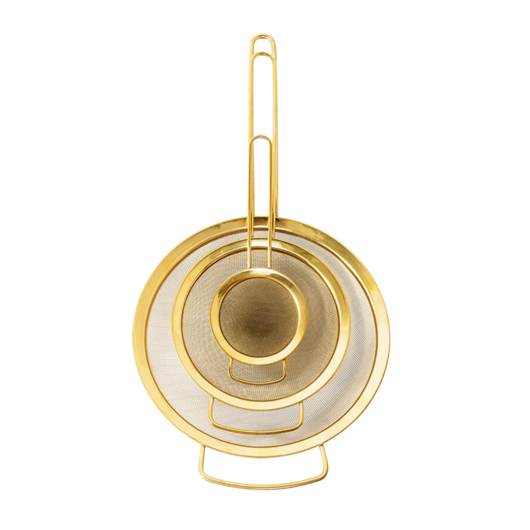 This set of three stainless steel strainers features a luxurious gold finish, combining functionality with elegance. Perfect for straining liquids and sifting ingredients, these strainers add a touch of sophistication to your kitchen tools.
