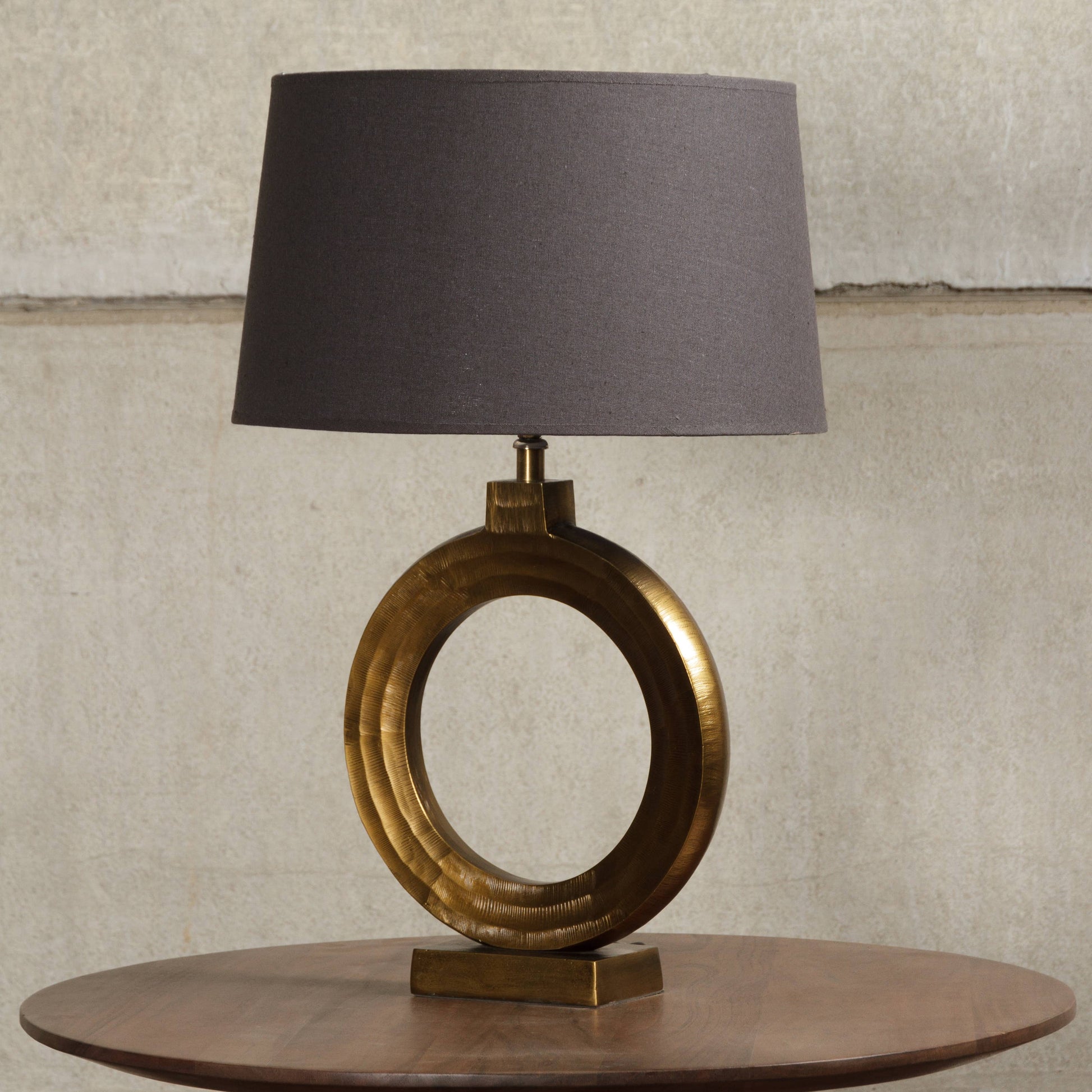 Striking and sculptural, this gold table lamp features a bold circular base with a black shade - perfect for adding modern glam to any room.