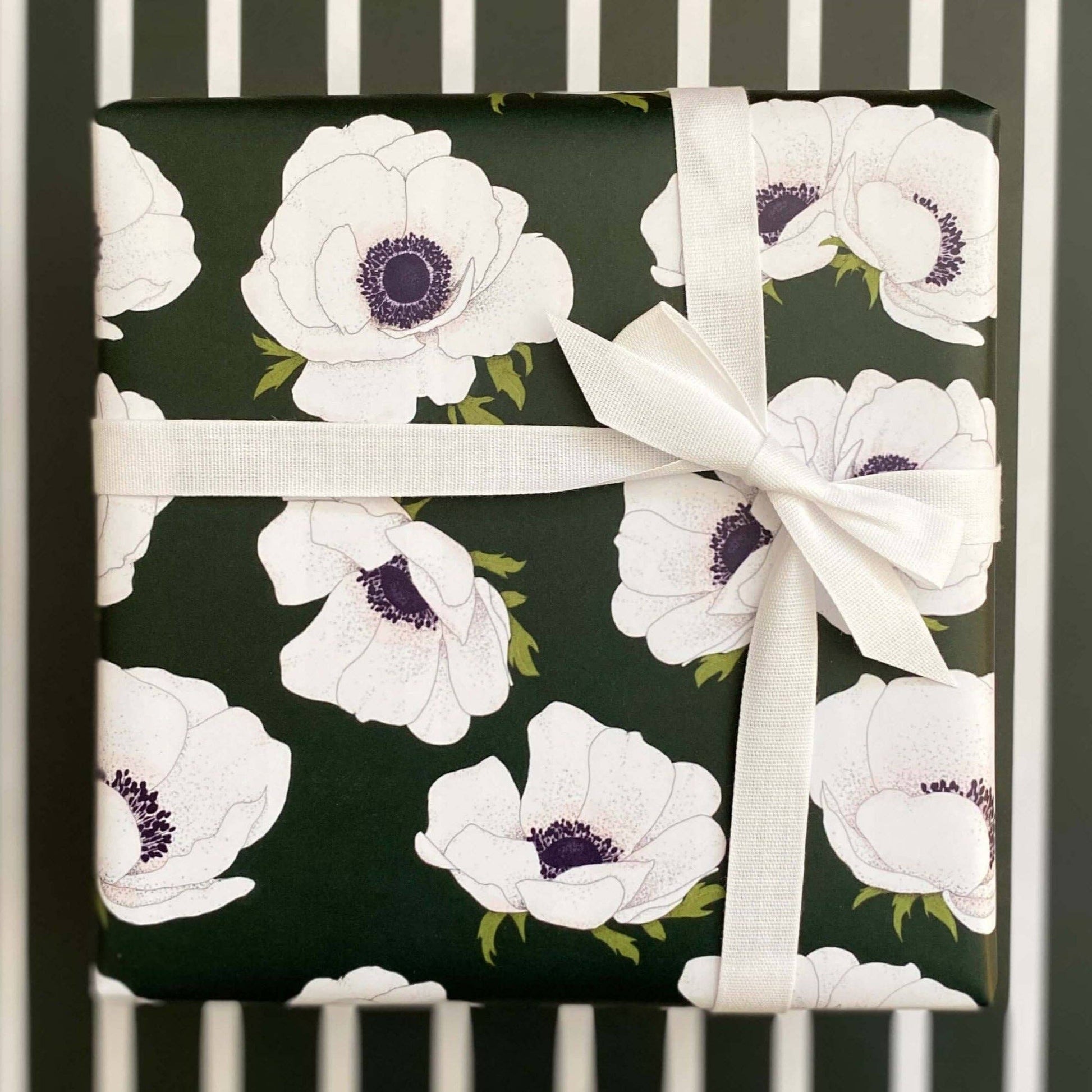 This luxury double-sided wrapping paper features white anemone on a deep green background. The opposite side features the dark green with white stripes.