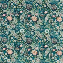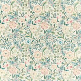 Created by combining elements from two William Morris designed embroideries Wilhelmina's scrolling acanthus leaves honeysuckle and foliage meld to create this all-over decorative design printed on a cotton linen mix. Available in three colorways: Ivory Teal and Moss.