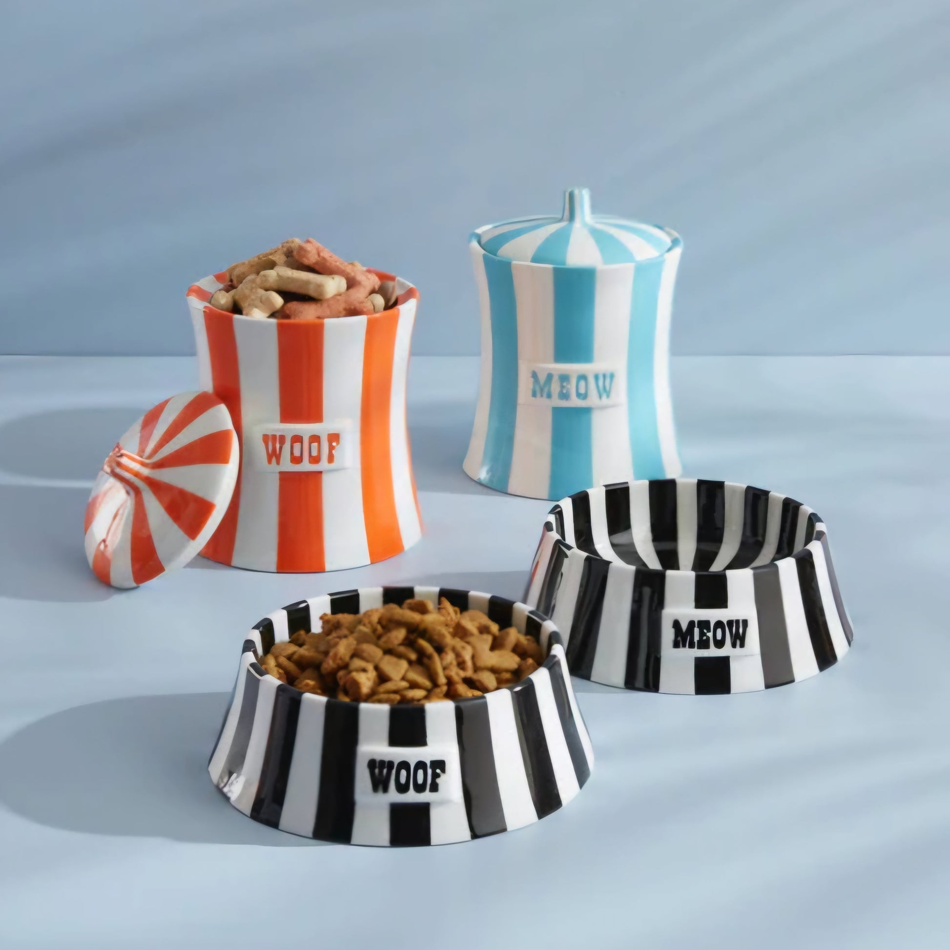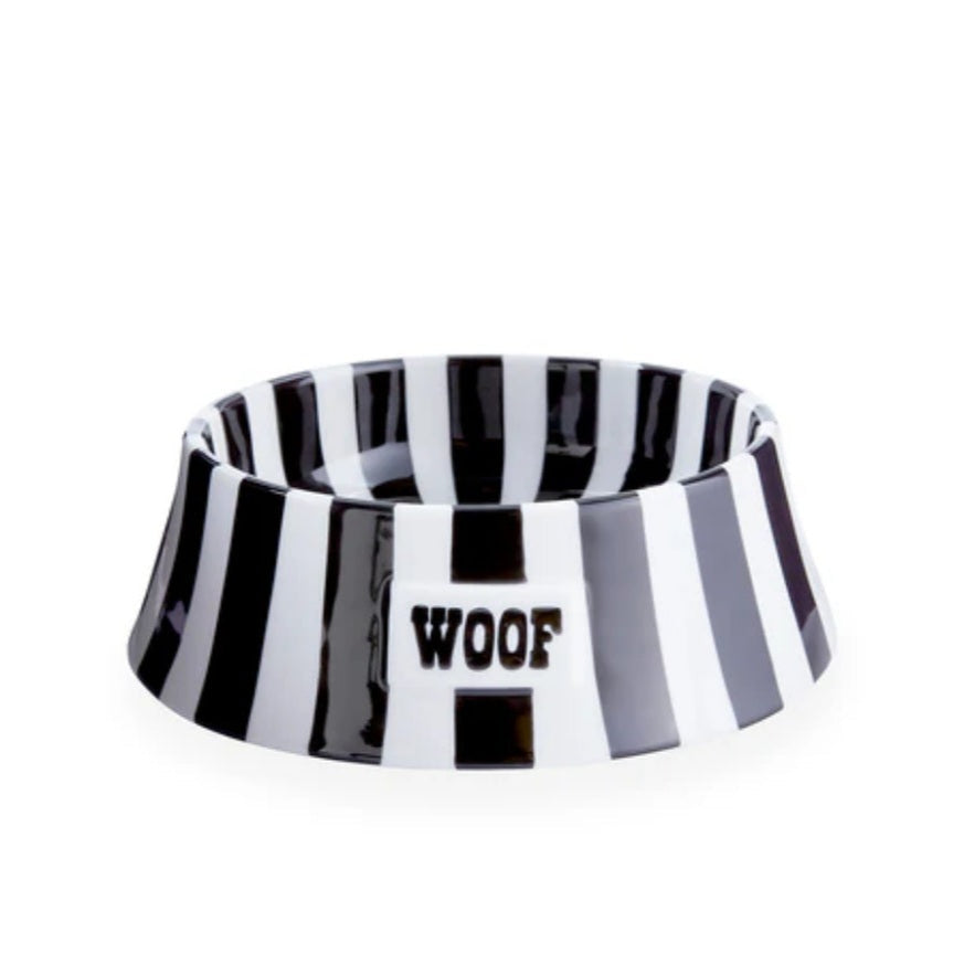 Spoil your pup or spoil your cat in style with Jonathan Adlers Woof pet bowl. Crafted from high-fired porcelain and adorned with his signature hand-painted black and white stripes, these bowls bring a bold touch to everyday meals and sips.